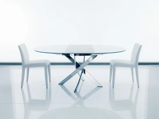 Стол круглый или овальный, раскладной или нераскладной, со структурой из стали. столешница из лакированного дерева и стекла, устойчивого к царапинам.