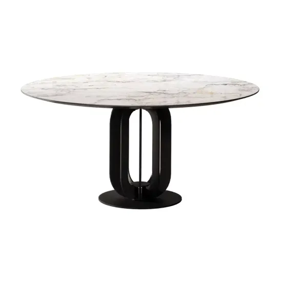 Круглый стол "Rotor" из коллекции "Argo" с опорой из металла черного цвета выглядит современным и стильным. Комбинация шпона и глянцевой керамики в столешнице добавляет привлекательный контраст и функциональность. Такой дизайн может подходить для различных интерьеров, включая современные, минималистичные, или индустриальные стили. Круглая форма стола делает его привлекательным для общения, так как люди могут удобно располагаться вокруг него. Цвет черной опоры может быть хорошим выбором, так как черный обычно сочетается со многими другими цветами и создает элегантный и сдержанный вид. Керамическая столешница добавляет прочности и устойчивости к повреждениям, что делает этот стол подходящим для повседневного использования и обслуживания гостей. "Rotor" - стильный и практичный выбор для современных интерьеров.