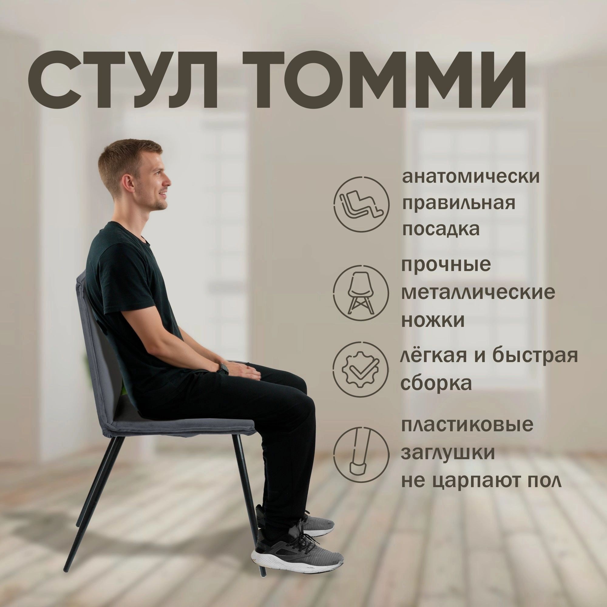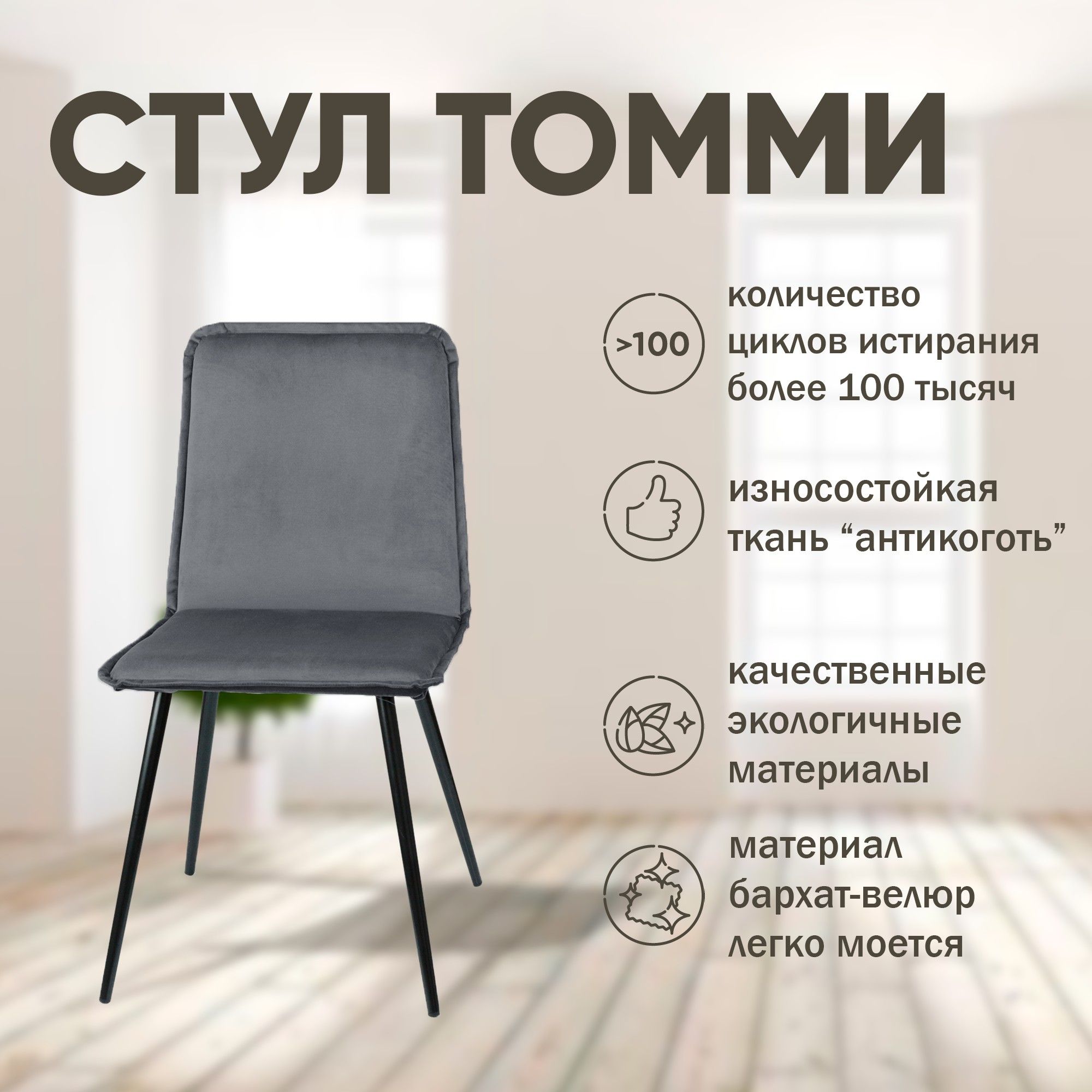 Стул велюровый Tommy — современное решение для вашей квартиры или офиса. Этот стул мягкий велюр выполнен из экологически чистых материалов, что безопасно для здоровья и гарантирует долговечность. Благодаря анатомически правильной посадке, стул подойдет для длительного сидения, будь то на кухне за обедом, в офисе для работы или в детской для учебы — серый стул на металлических ножках органично впишется в любой интерьер. Прочные металлические ножки обеспечивают надежную устойчивость, а пластиковые заглушки защитят пол от царапин. Обивка из бархат-велюра отличается не только элегантным внешним видом, но и практичностью: она легко очищается и имеет свойства антикоготь. Количество циклов истирания превышает 100 000, что гарантирует долгий срок службы. Особое внимание заслуживает съемный чехол — он надежно крепится, просто снимается и меняется, что позволяет сохранять идеальный внешний вид даже при интенсивной эксплуатации. Стул на кухню, в офис, в детскую — Tommy универсален и комфортен. Стильный внешний вид и легкая сборка делают его отличным выбором для дома или бизнеса. Позвольте себе комфорт и практичность каждый день, выбрав стул велюровый Tommy. Приобретайте сейчас, чтобы подчеркнуть ваш современный стиль и создать уютную атмосферу в любом помещении!